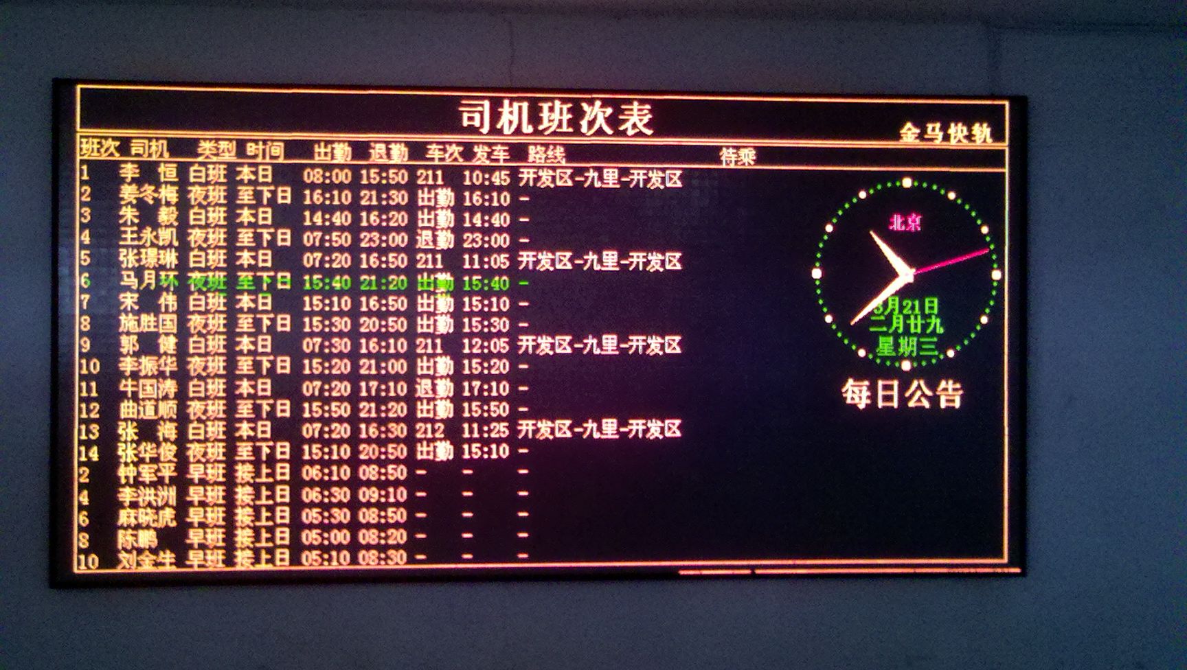 大屏幕及查詢(xún)系統(tǒng)滿足地鐵列車(chē)運(yùn)營(yíng)時(shí)刻表和司機(jī)相關(guān)作業(yè)規(guī)定的需要,動(dòng)態(tài)掌握司機(jī)狀況,自動(dòng)生成合理的司機(jī)出乘計(jì)劃,使派班管理員減少重復(fù)勞動(dòng),提高工作效率。同時(shí)避免人為因素出現(xiàn)的計(jì)劃編制差錯(cuò),實(shí)現(xiàn)對(duì)司機(jī)的科學(xué)、規(guī)范管理。