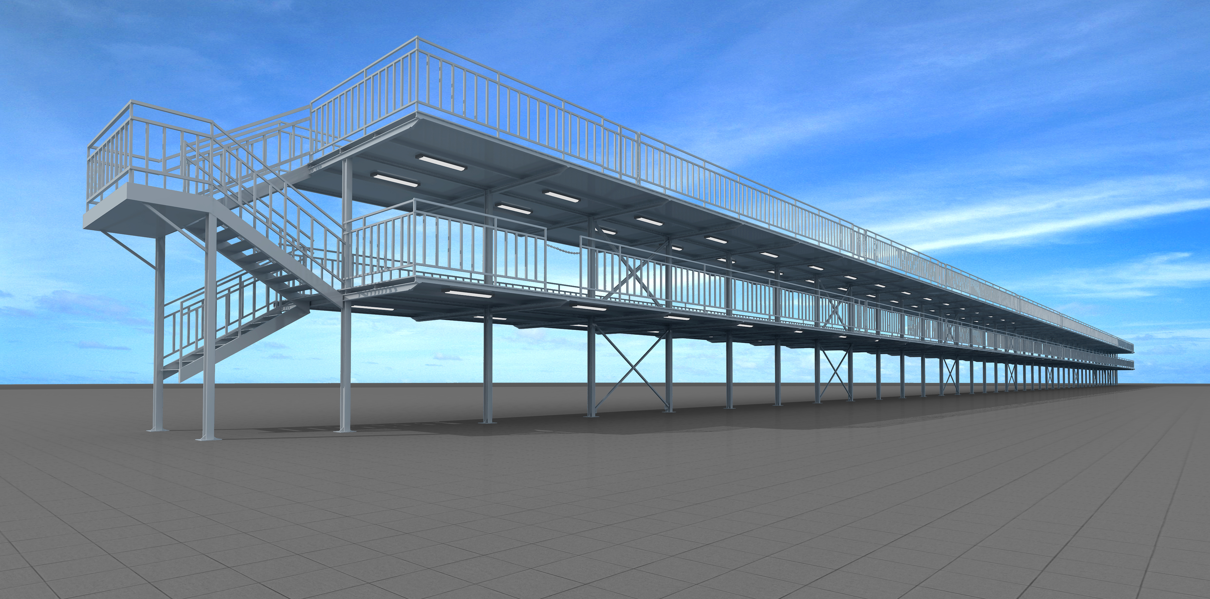 上圖為地鐵車輛段三層檢修作業(yè)平臺。采用全鋼結(jié)構(gòu),為地鐵車輛檢修、維護提供操作平臺。